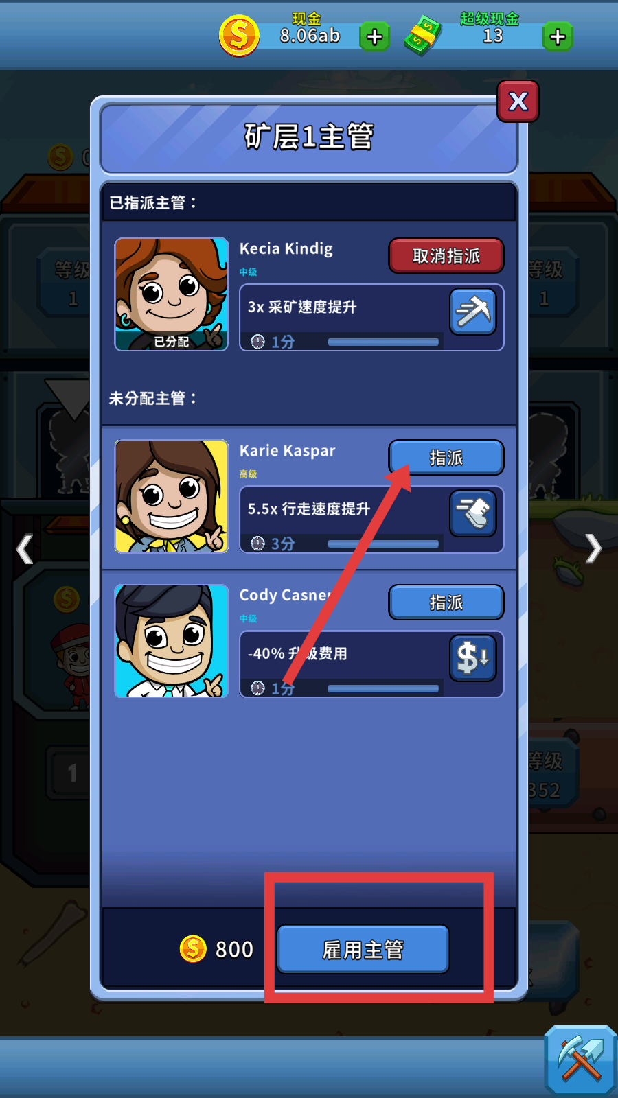 2、花费800金币雇佣新主管,指派高等级主管(如Karie-Kaspar)到矿层,利用其buff优化生产。