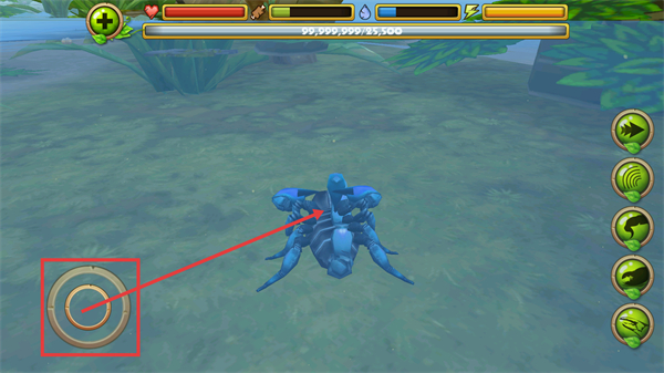 1、操控蓝色蝎子移动,通过界面左侧的控制按钮调整位置,准备与目标生物交互。