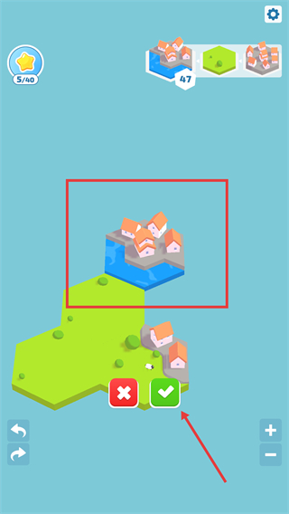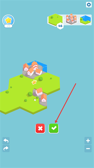 3、箭头指向【绿色对勾】按钮,放置【绿色六边形】后解锁房屋区,收集星星推进。
