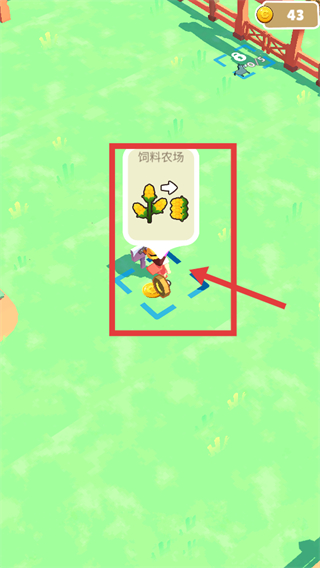 3、界面显示【饲料农场】,点击标注区域消耗金币(剩余【43】),运营该农场获取饲料资源,为其他农场生产提供支持。