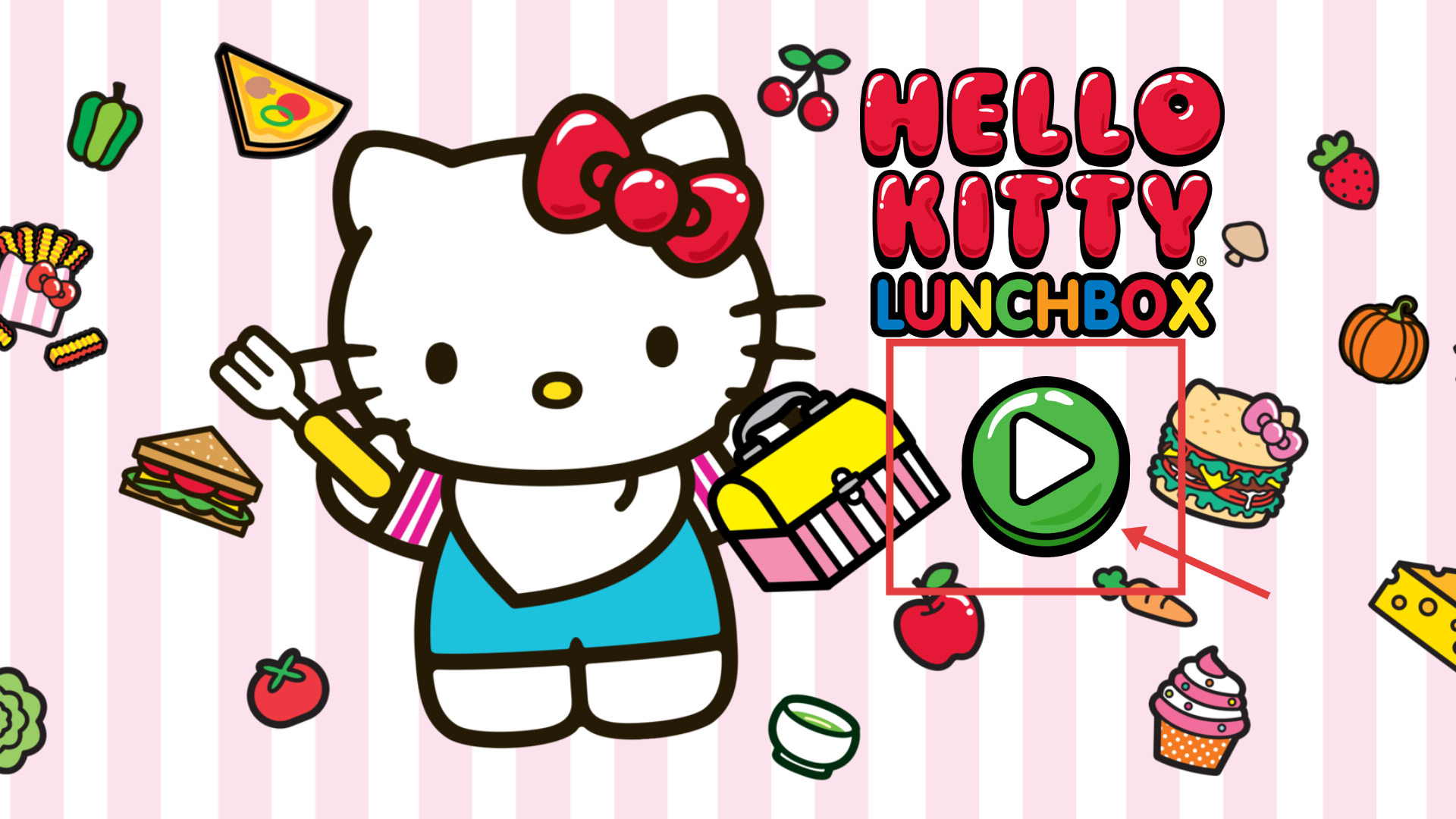 1、找到【HELLO-KITTY-LUNCHBOX】界面里的【绿色播放】按钮,点击该按钮即可进入午餐盒制作关卡。