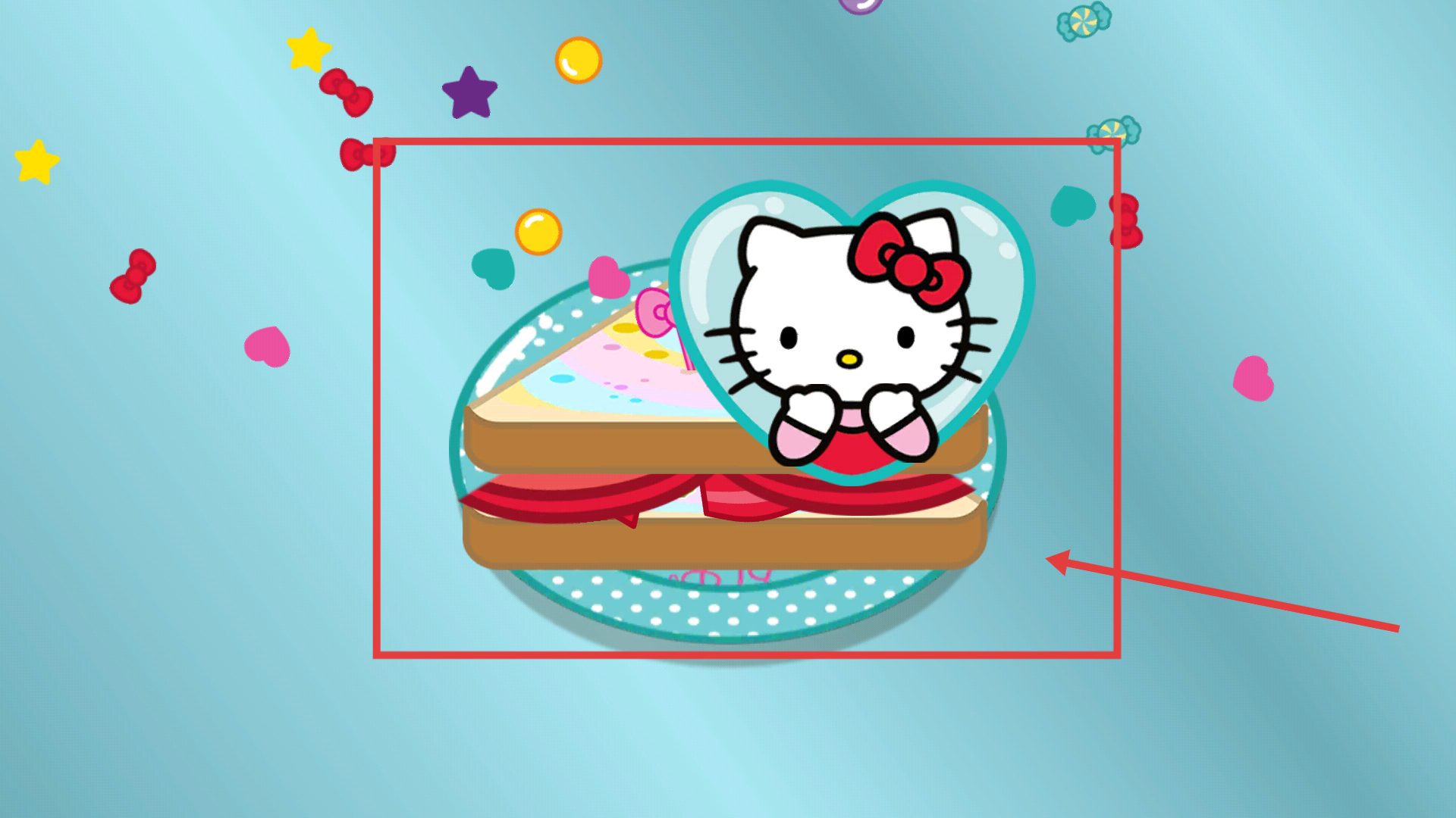 4、制作完成后会出现装饰有Hello-Kitty的午餐成品,伴随彩带动效,代表该关卡的午餐盒制作任务完成。
