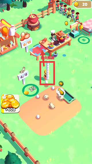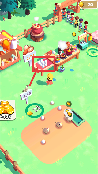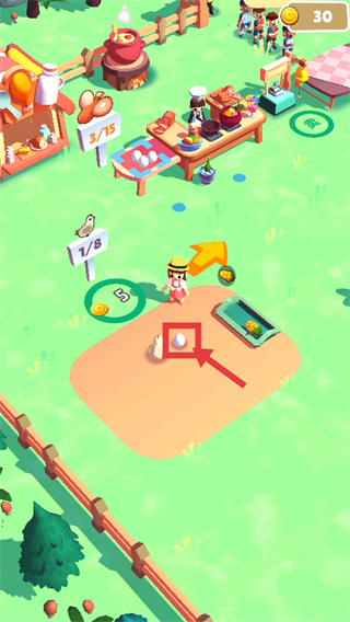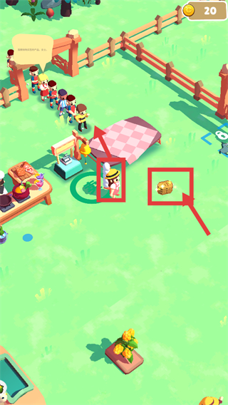 4、操控角色移动至标注区域,收集该区域的金币,同时与排队人群互动,持续积累资源并推进农场的运营流程。