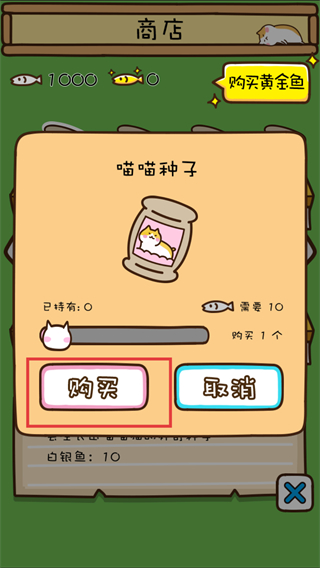 2、在购买确认弹窗中点击【购买】按钮,消耗【10】鱼获取【喵喵种子】,弹窗自动关闭返回商店。
