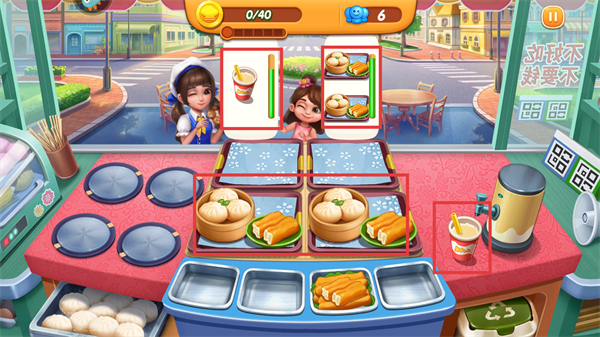 2、观察顾客需求,优先制作【饮料】与【包子】-【油条】组合餐品,及时递送给对应顾客积累金币进度。