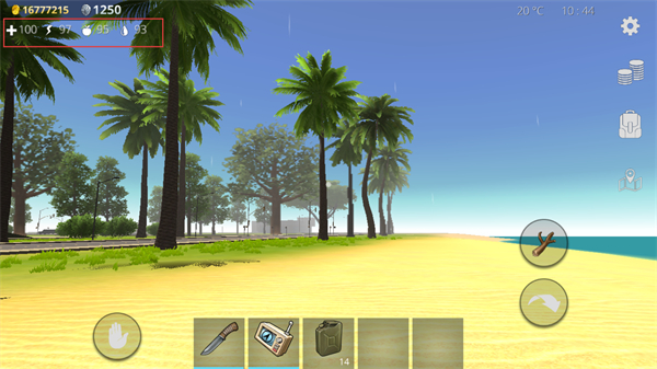 4、关注界面顶部的人物数值,在海滩区域拾取【树枝】类物资,持续维持生存资源充足。