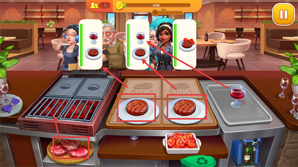 3、观察顾客订单需求,取【餐盘】中的【牛排】,搭配对应食材,按指引将菜品配送至对应顾客,推进订单进度。