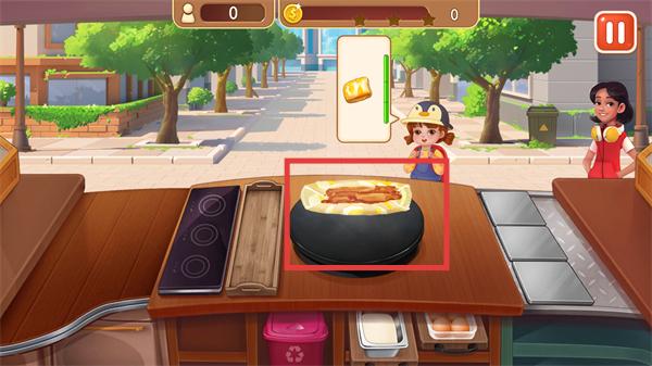 3、根据顾客需求(显示“蛋”),将煎好的食材(搭配培根)制作成对应餐品,完成顾客订单。
