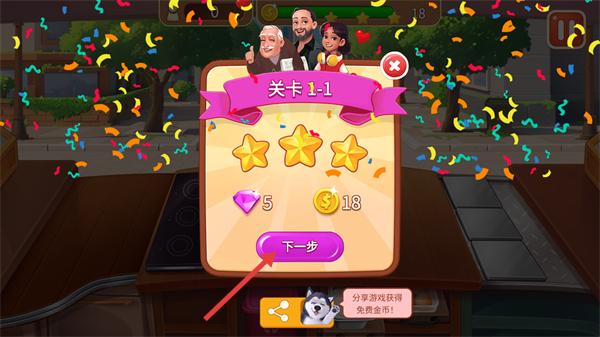 4、完成关卡1-1后获得三星评价,领取5钻石、18金币奖励,点击【下一步】进入下一个经营关卡。