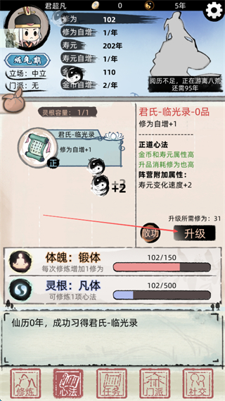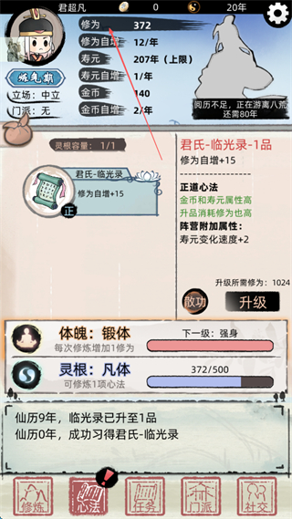 1、获得君氏-临光录心法,其提供修为自增等属性加成,助力修仙进程。