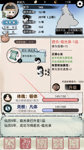 3、积累修为提升体魄数值,逐步解锁体魄下一阶段进阶。