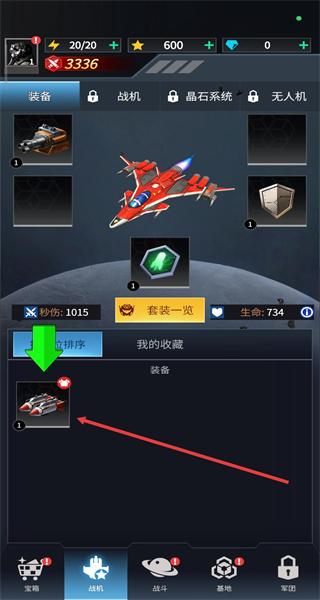 1、在游戏主页中可点击底部导航栏的战机按钮,可进入战机的装备配置界面。