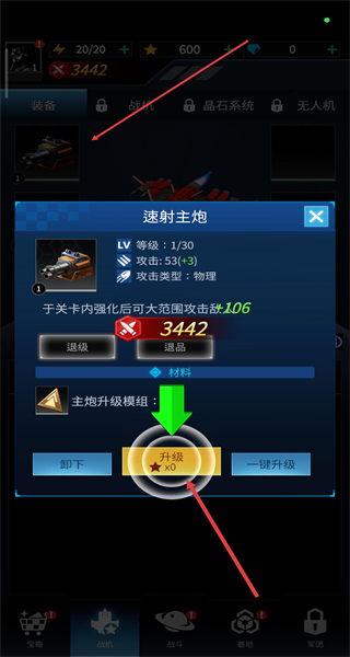 4、选择已装备的武器如“速射主炮”,在其界面中消耗对应资源,点击升级提升武器等级,强化攻击属性。