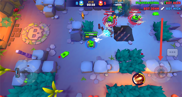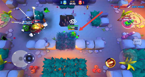 3、滑动操纵杆操控坦克移动至树丛区域,进入树丛后可隐藏自身视野。