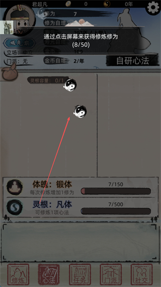 3、点击屏幕获取修为,积累数值解锁自研心法等功能。