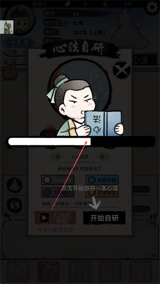 4、在心法自研界面选择选项,点击开始自研学习心法提升实力。