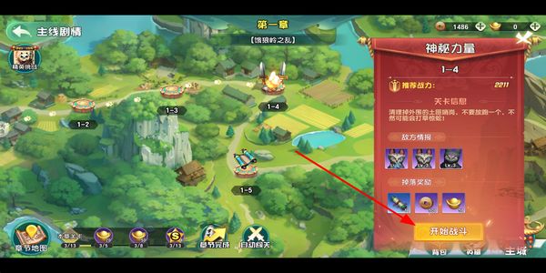 1、进入游戏地图选择关卡,查看关卡的推荐战力和掉落奖励,确认后点击开始战斗按钮,即可进入关卡的战斗准备。