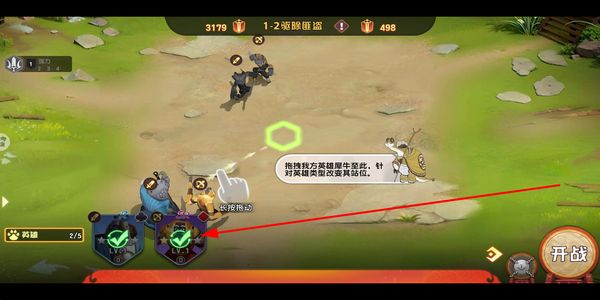 2、准备阶段长按拖动己方英雄,调整其站位位置,根据英雄类型搭配合适站位,设置完成后点击开战按钮开启战斗。