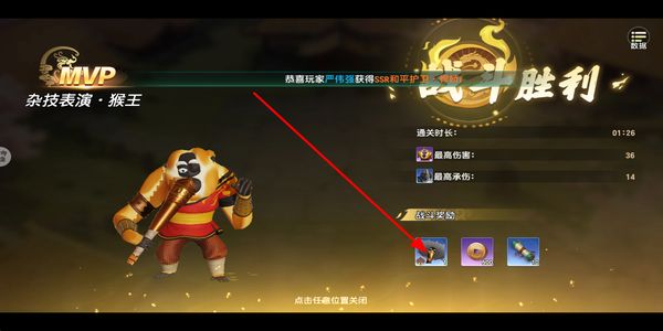 4、胜利后会显示结算界面,查看获得的奖励道具和战斗数据,点击任意位置关闭界面,完成本次关卡的挑战。