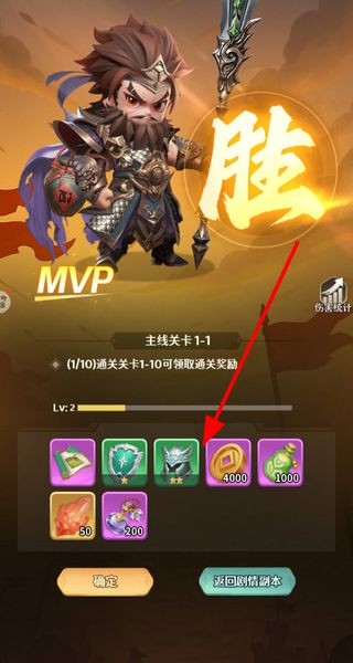 3、成功通关关卡后会显示胜利界面,查看获得的各类奖励道具,点击确定按钮即可领取奖励,结束本次关卡流程。