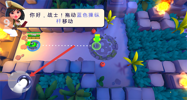 2、进入关卡后,拖动蓝色操纵杆,操控己方坦克在场景内移动,调整合适的作战站位。