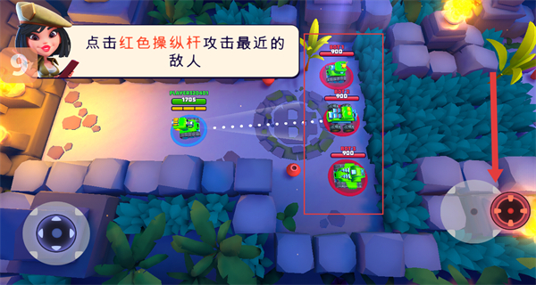 3、点击红色操纵杆,触发攻击操作,锁定并攻击距离最近的敌方坦克,推进对战节奏。