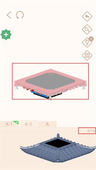 3、拼接【平台面板部件】,覆盖框架区域,进度变为【2/10】,准备添加顶部建筑部件。