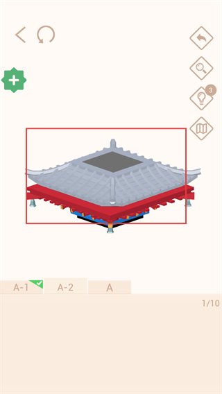 4、放置【屋顶部件】到平台上方,匹配建筑的顶部结构,进度更新为【1/10】,完成核心拼接。