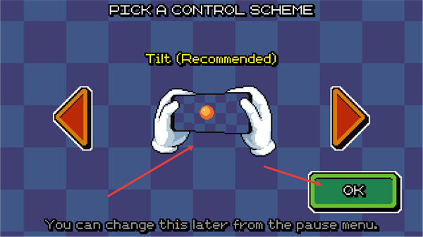 2、在【Pick-A-Control-Scheme】界面,选择推荐的【Tilt-(Recommended)】控制方案,点击【OK】按钮确认进入游戏。