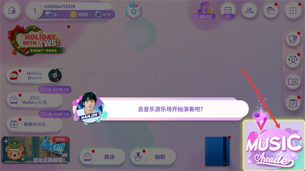 1、在主界面点击箭头所指位置,进入音乐游玩模块。