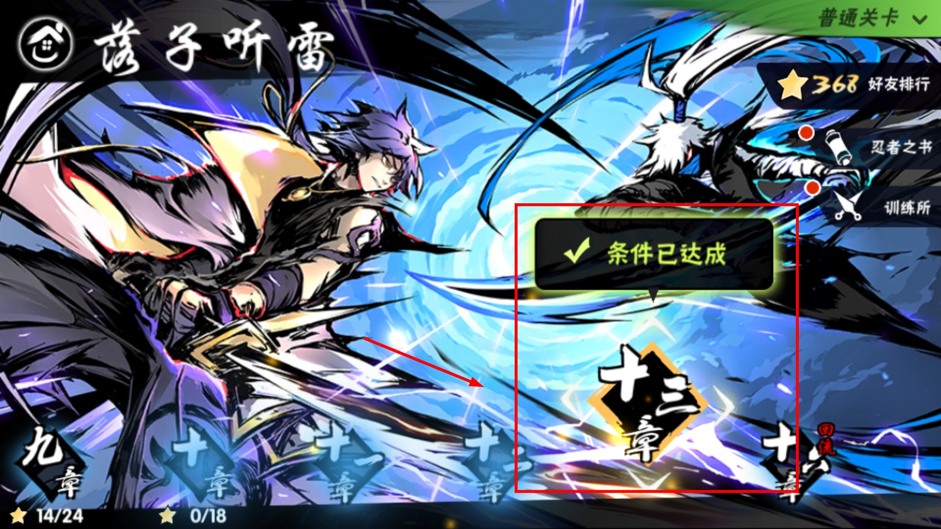 1、进入【游子听雷】章节选择界面,优先选择条件已达成的【十三章】,快速推进主线剧情解锁新内容。