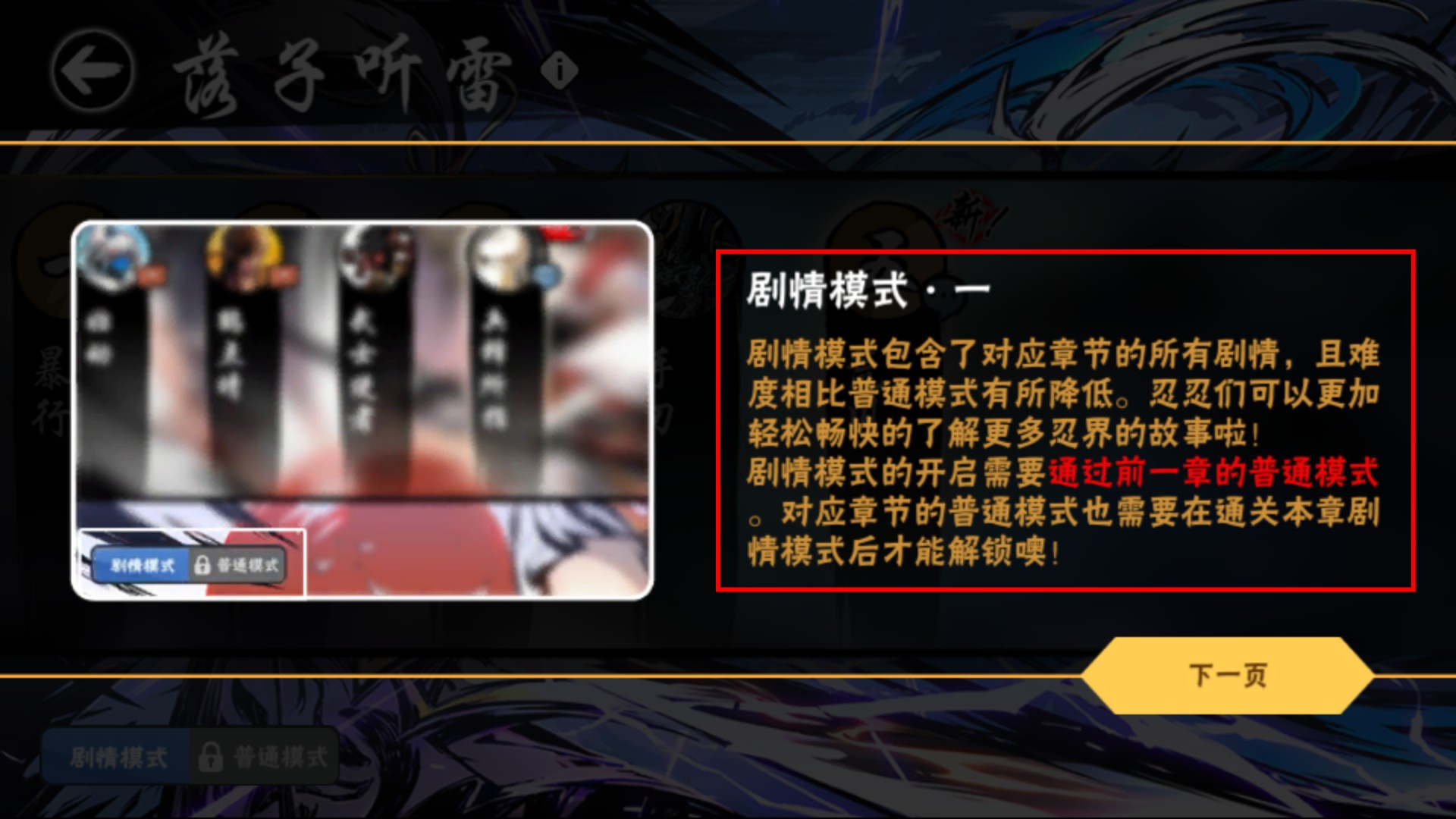 2、解锁【剧情模式】需先通关前一章普通模式,该模式难度更低,能轻松了解忍界故事且体验流畅。