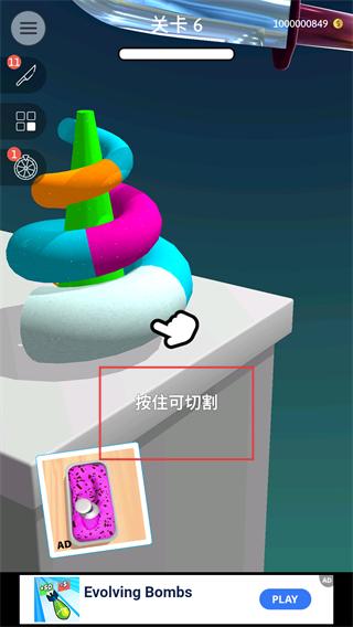 2、进入【关卡6】,根据提示【按住可切割】,长按操控刀具,对彩色螺旋物品进行切割操作。