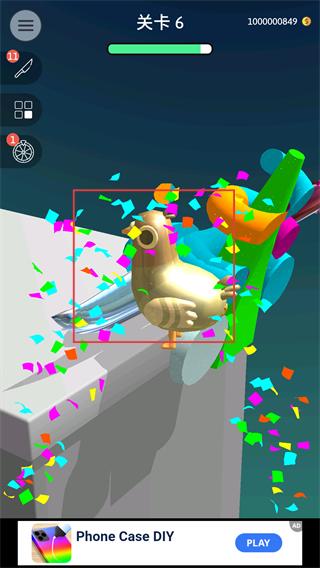 3、持续长按切割,物品破碎后会出现金色小鸭,同时伴随彩色碎片特效,推进关卡进度。
