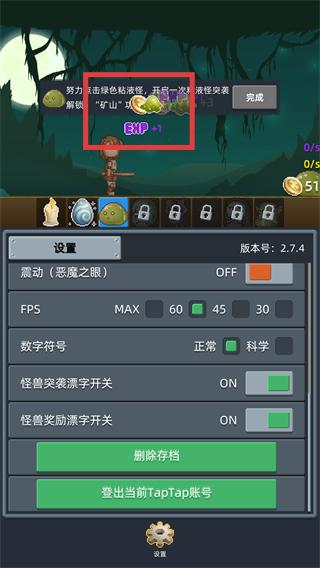 1、点击绿色怪物可获得【EXP+1】,同时推进解锁【矿山】功能的进度,积累成长资源。