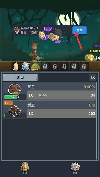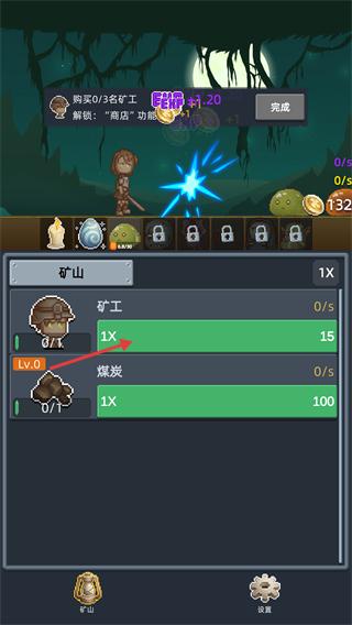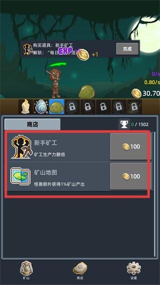 4、解锁【商店】后,消耗金币购买【新手矿工】【矿山地图】,提升矿工生产力与矿山产出。