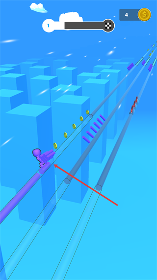 2、滑动控制角色移动时,留意路径上的金币并收集,同时获取紫色道具来强化角色,助力后续推进。