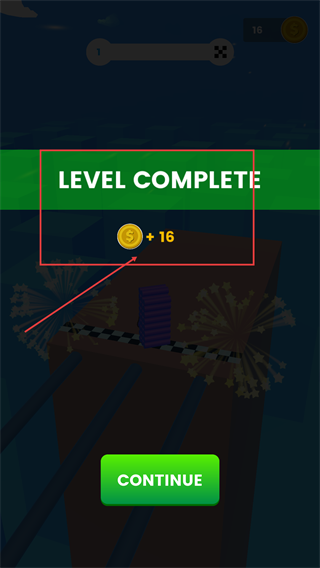 4、达成关卡目标后会显示【LEVEL-COMPLETE】,获取对应金币奖励,点击【CONTINUE】按钮进入下一关。