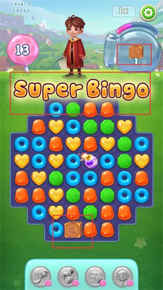 4、触发【Super-Bingo】特效,剩余步数保持【13】,目标收集数完成,推进【Level-2】关卡进度。