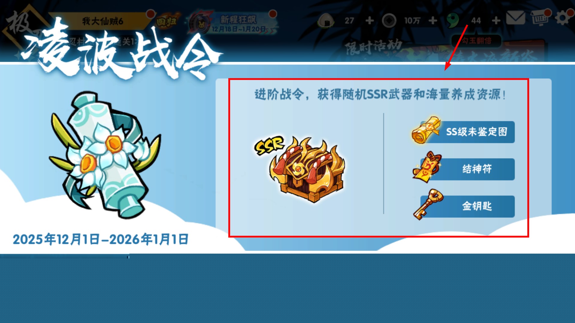 1、进阶战令可获取随机【SSR】武器与海量养成资源,还能拿到【SS级未鉴定图】-【结神符】-【金钥匙】助力养成。