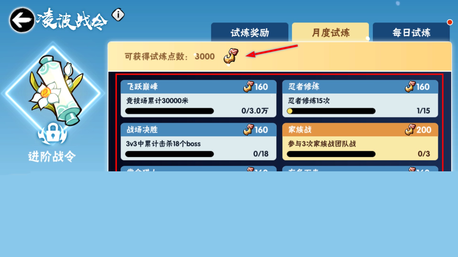 2、完成【飞跃巅峰】-【忍者修炼】等试炼任务,每个任务可获160试炼点数,累计3000点数兑换奖励。