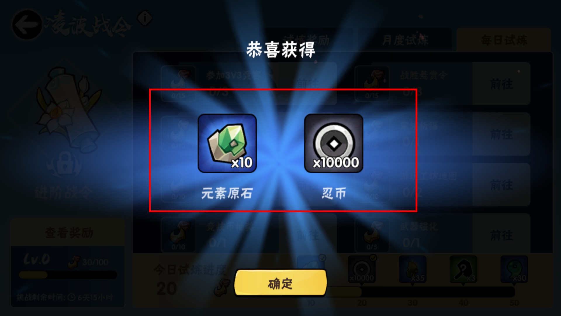 4、完成试炼任务达到进度后,可获得【元素原石×10】-【忍币×10000】为后续养成提供资源支持。