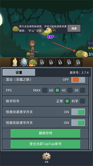 4、点击绿色怪物开启快速发展,解锁【矿山】功能,同时可在设置界面调整游戏参数。