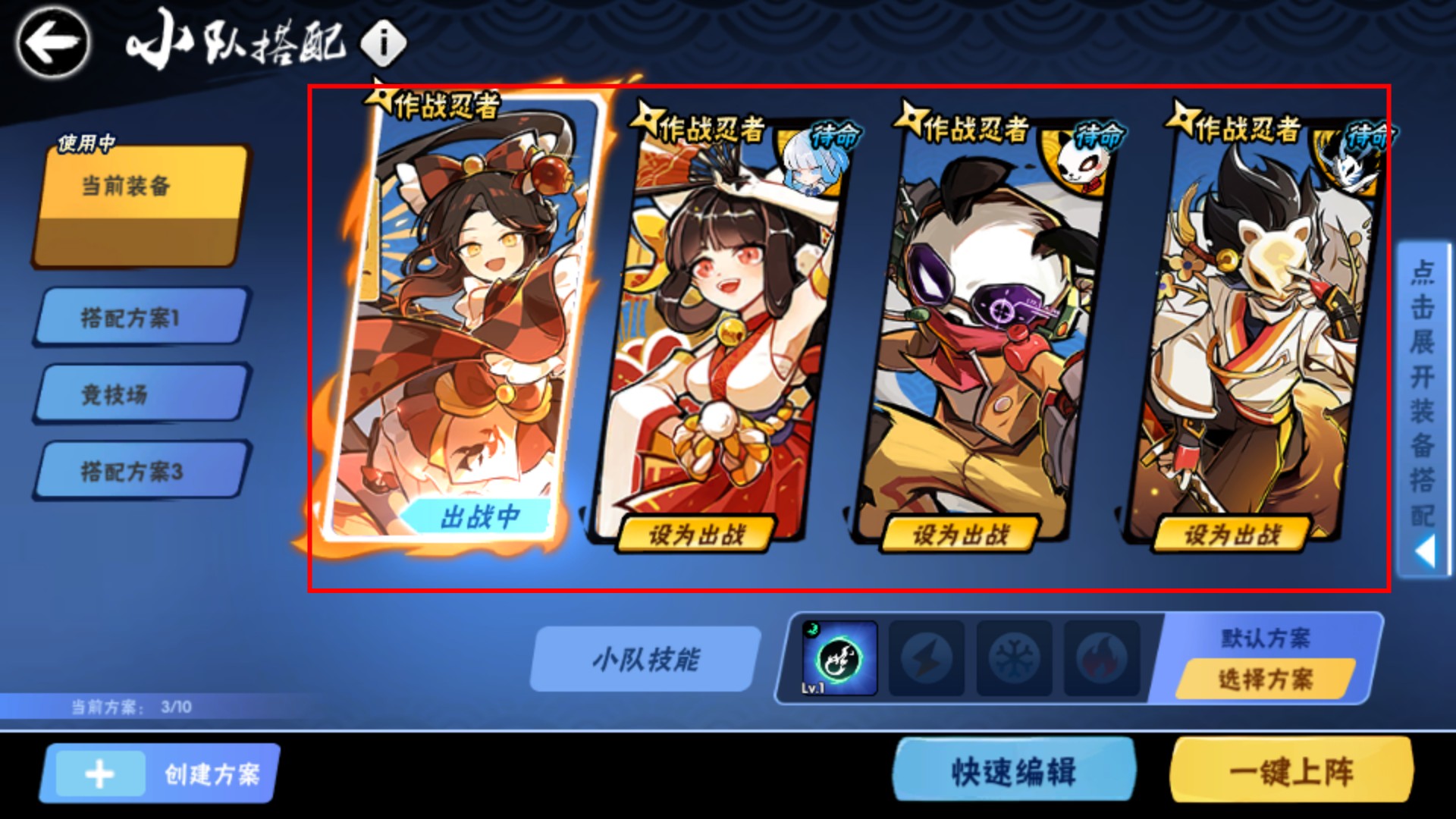 1、在小队搭配界面,将合适的【作战忍者】设为【出战中】,调整搭配方案,增强队伍战斗适配性,合理配置提升整体战力。