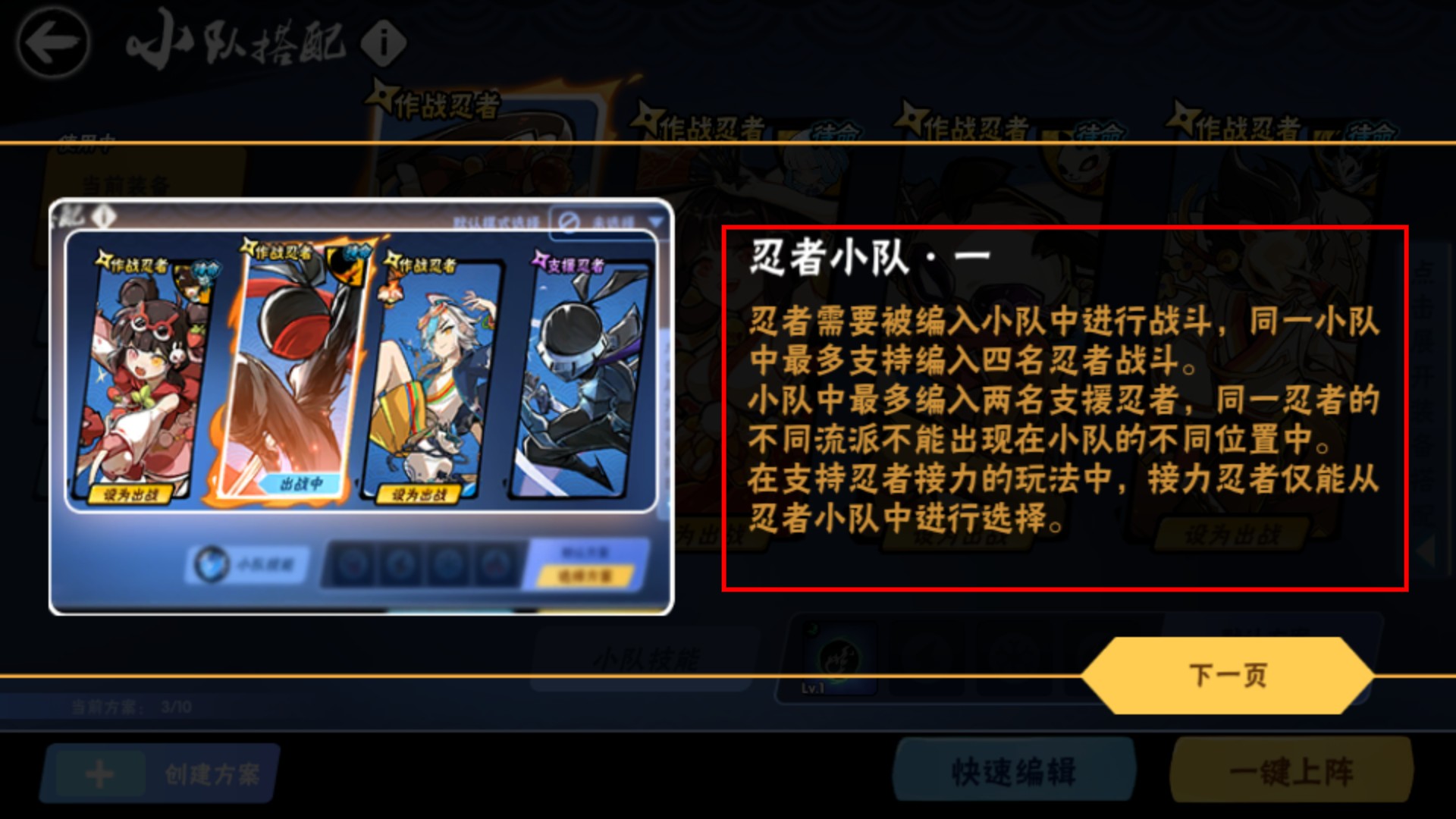 2、组建忍者小队时,最多编四名【战斗忍者】与两名【支援忍者】,接力忍者从已编小队选,避免同忍者不同流派同队。