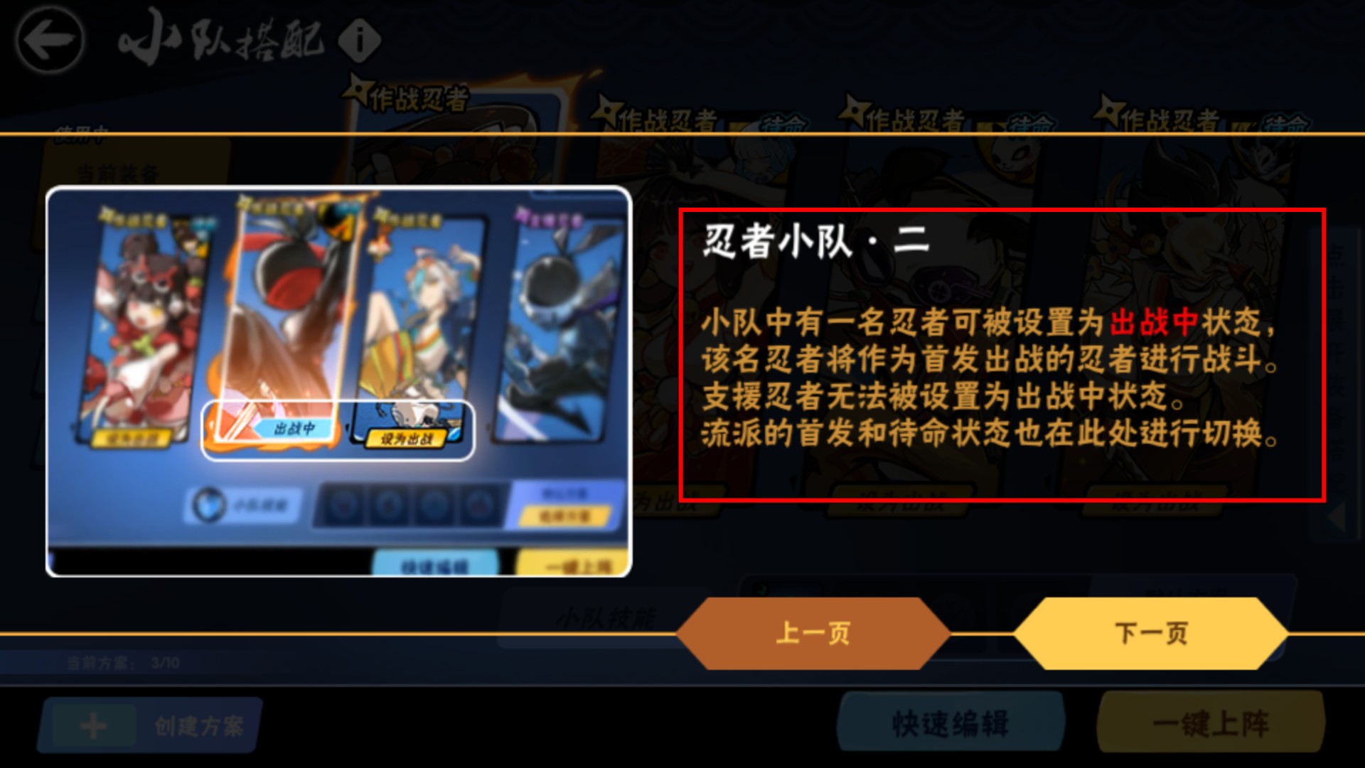 3、设置小队中一名【作战忍者】为【出战中】作首发,支援忍者无法出战,可切换忍者流派的首发与待命状态。