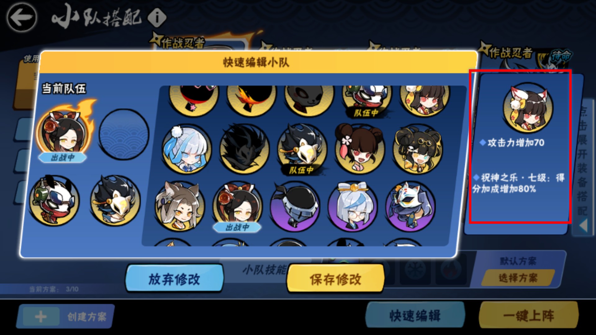4、快速编辑小队时,查看忍者的【攻击力增加70】【得分加成80%】增益,优化配置后保存修改提升实战效果。