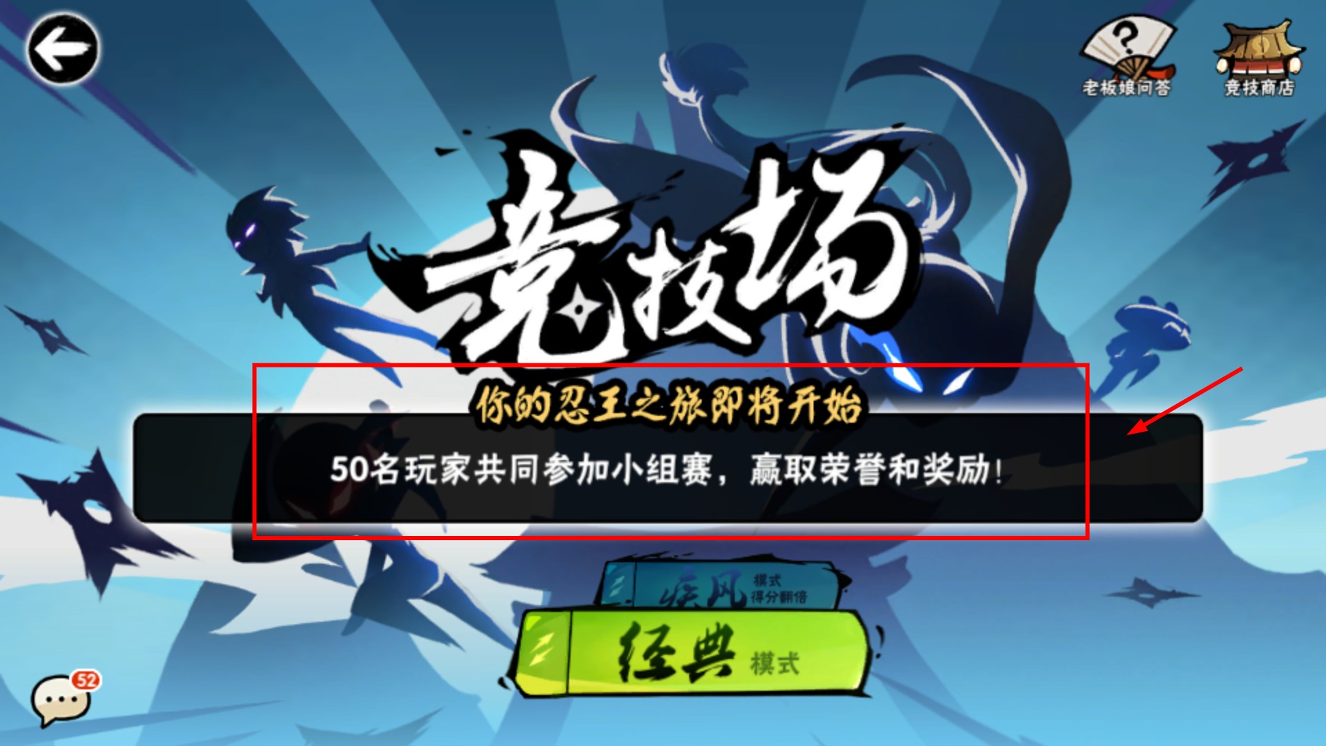 2、进入竞技场后参与50人小组赛,通过竞技表现赢取荣誉与奖励,开启忍王之旅。