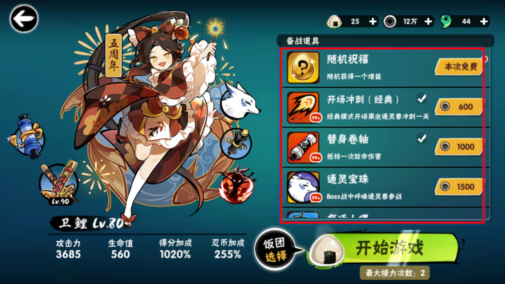 3、备战时选用【随机祝福】-【开场冲刺】等道具,提升竞技表现与生存能力。
