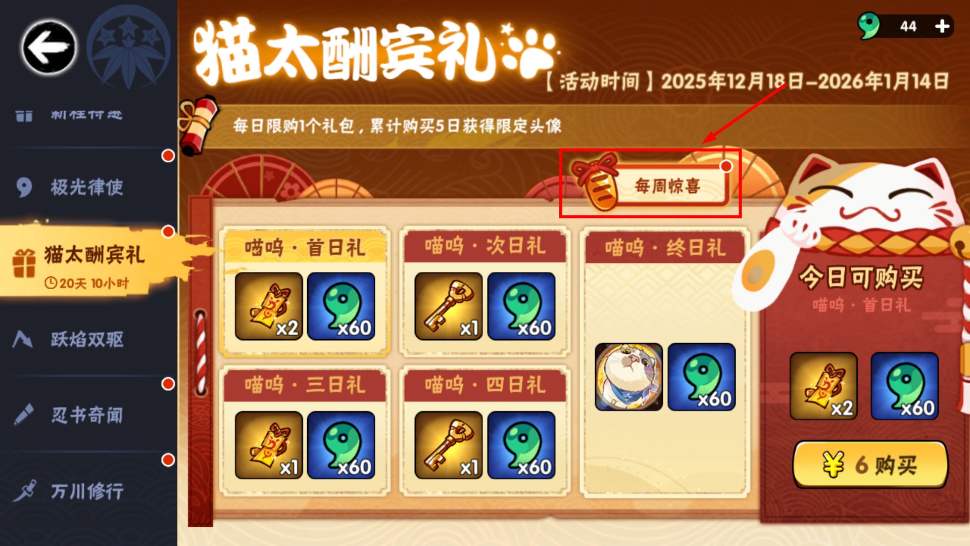 2、进入【猫太酬宾礼】界面,点击【每周惊喜】查看额外福利,注意每日限购与累计购买的限定头像奖励。